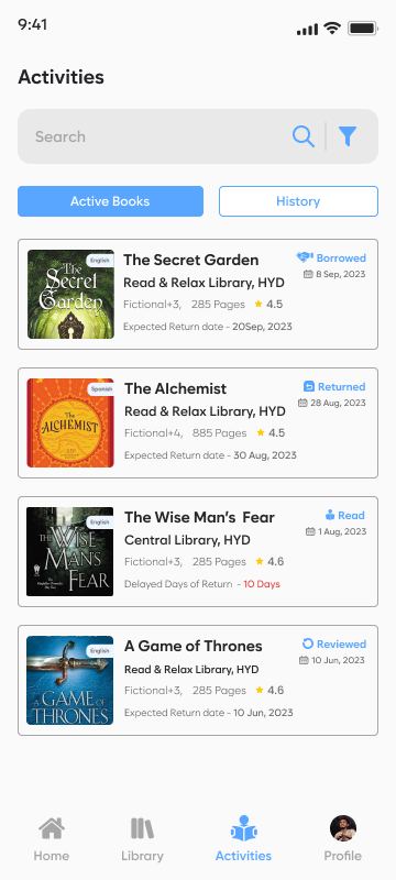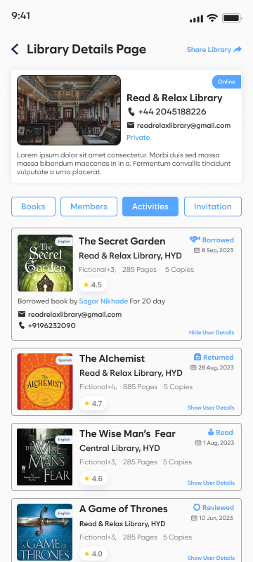 Kimoor makes borrowing books simple, fast, and well-organized. Users can search thousands of titles from connected libraries and rent books directly through the app. Every library listed can issue and track books through an admin panel, making the process smooth for both readers and library owners. Readers can mark the status of each book as Reading, Paused, or Completed, and track their progress in an elegant timeline. Usage activities show how much time was spent reading each book, helping users understand their habits and stay motivated. Return reminders ensure that books are handed back on time, and rating options allow users to share feedback and discover popular reads. With a mix of local libraries and a central book database, Kimoor helps users find more books than ever before without purchasing them. It’s a complete reading companion — search, rent, track, and enjoy.